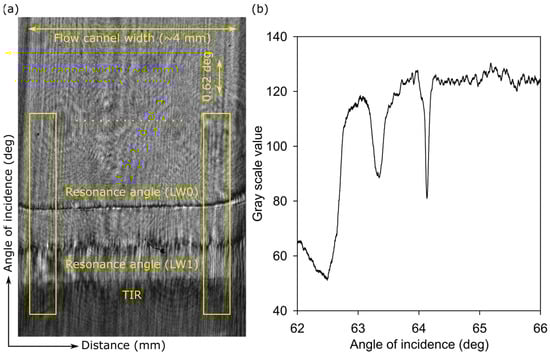 A typical two-dimensional (2D) reflectivity assessment of an LW is provided in Figure 5a, where positions of TIR and resonance angles for zero (LW0)- and first (LW1)-order modes are marked. As described in Section 2.4, the 2D reflectivity curves were converted into one-dimensional (1D) reflectivity curves by drawing rectangles (shown in Figure 5a) and plotting average grayscale value versus the height of the rectangle (i.e., angle of incidence), where the grayscale values were averaged over the width of the rectangle (i.e., the distance along the width of the flow channel). Using the center of gravity algorithm, the position of dip for the resonance angle corresponding to LW0 was determined. Additionally, shifts in the resonance angle corresponding to LW0 were monitored as 10 mM phosphate buffer solutions with different pH values were introduced.