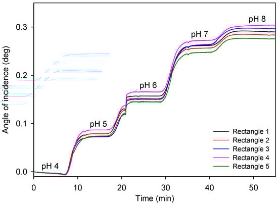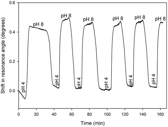 Figure 6 provides a typical plot of shifts in resonance angles versus time as 10 mM phosphate buffers with different pH values were introduced. As expected, the resonance angle of LW shifts to higher values as the pH increases from 4 to 8. This is because an LW with a hydrogel film containing DMA is expected to be more swollen and hence have a lower refractive index at pH 4 than 8. Consequentially, the resonance angle of the LW with DMA-containing hydrogel film is expected to be lower at pH 4 than at 8, which is in line with the experimental data presented in Figure 6.