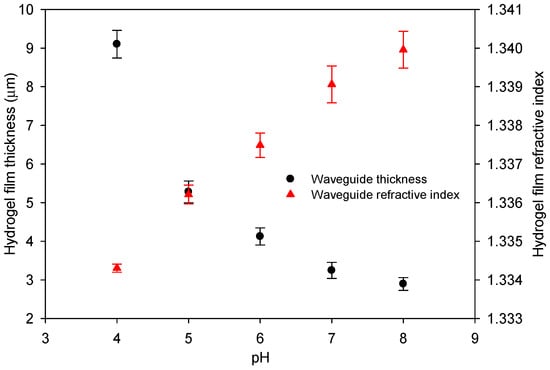 where k is a constant. We can use this model to determine the refractive index and thickness of the waveguide film at different pH values by first substituting for in Equation (5), where is known from separate refractometric measurements. The values of k and h that give the best fit to the observed changes in resonance angles can then be determined. Figure 7 shows the thickness and refractive index of a hydrogel film made using the 5% (w:v) monomer solution containing a 20% molar ratio of DMA for different pH solutions. Figure 7 shows that the hydrogel film swells by a factor of about 3, from pH 8 to pH 4, and the refractive index reduces by about 0.006 over this pH range.