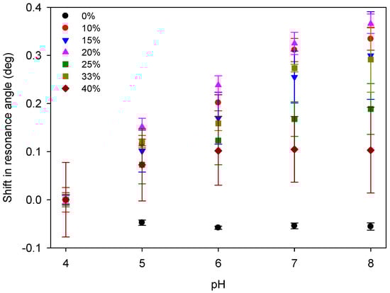 Subsequently, the molar ratio of DMA in hydrogel films was varied and the shift in the resonance angle of the corresponding LWs was studied as a function of pH. Figure 8 shows that an LW with a hydrogel film containing no DMA was not responsive to pH, as exemplified by the absence of/minimal shift in resonance angle versus pH. In contrast, an LW with the hydrogel film containing 20% DMA resulted in the largest change in resonance angle, 0.3658° (0.0915° pH−1), over the pH range from 4 to 8. Based on the angular noise of the measurement, the resolution of the measurement is ~0.004 pH units, which compares favorably with glass pH electrodes with a resolution of ~0.01. LWs with hydrogel films containing 10% and 15% DMA were only slightly less sensitive. However, an LW with a hydrogel film containing 40% DMA showed a significantly reduced response to pH changes. Thus, LWs with hydrogel films containing 10% to 20% DMA were used for subsequent work.