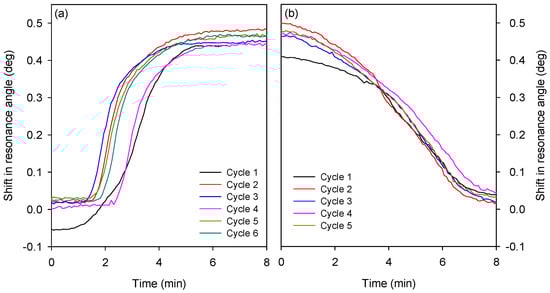 Shift in resonance angle versus time of an LW exposed to cycles of (a) pH 4 to pH 8 and (b) pH 8 to pH 4.