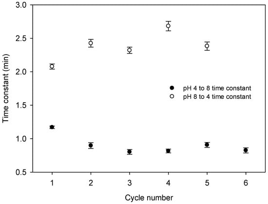 Time constant of an LW exposed to cycles of pH 4 to pH 8 and pH 8 to pH 4.