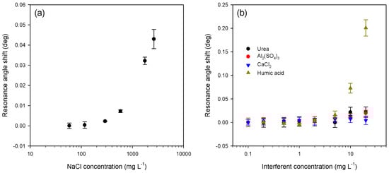 Water supplied to consumers can contain interferents such as sodium chloride, urea, aluminum sulfate, calcium chloride, and humic acid. The presence of interferents can potentially change the resonance angles of LWs because of changes in the refractive index of sample solutions, i.e., nc. Thus, the effect of the presence of interferents was studied on an LW comprising a hydrogel film made using a 5% (w:v) total monomer solution and a 10% molar ratio of DMA. The effect of sodium chloride was studied up to 2600 mg L−1, while the other interferents were studied up to 20 mg L−1. Figure 12 shows that, for concentrations of sodium chloride, urea, aluminum sulfate, calcium chloride and humic acid up to 1755, 5, 5, 20, and 2 mg L−1 respectively, the shift in resonance angle of the LW was minimal and hence the error in pH introduced by these interferents at up to the aforementioned levels was less than 0.1. Thus, the reported LW sensor with a waveguide film made of acrylamide and DMA, with the latter present at 10% molar ratio, is well suited to measuring pH between 4 and 8 in the presence of common interferents at typical concentration levels.