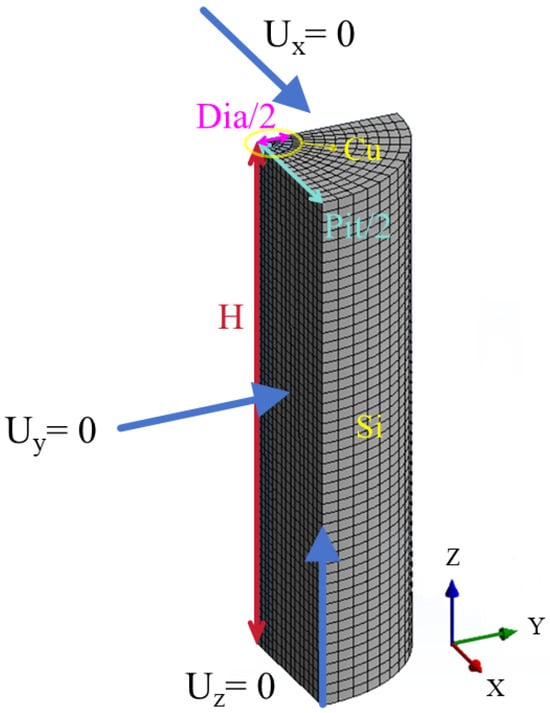 The schematic of the TTSV model is illustrated in Figure 1. The 3D TTSV model is constructed by ANSYS 2022 R1 for transient thermal stress analysis. The thermal stress simulation of TTSV can be transformed into the application of a single TTSV unit in the algorithm analysis based on the linear superposition principle []. However, this paper does not provide a detailed analysis of the factors that influence the interaction between TTSVs (such as density and relative angle). Therefore, only a single TTSV unit is analyzed instead of considering the TTSV periodic array. In the 3D model domain, Cu and Si are, respectively, used as the filling material for TTSV and the substrate with the via diameter of Dia, the via height of H, the aspect ratio of Asp (the quotient of H divided by Dia) and the pitch of Pit. Thin insulation and diffusion barrier layers are neglected. By applying symmetry conditions, the model simplifies to 1/4 unit. Using the sweeping method (Figure 2), 103,753 elements are meshed. The normal displacement at two symmetric interfaces is constrained to zero to ensure symmetry, and the Z-axis displacement at the bottom interface is limited to zero to reflect the actual constraints imposed on TTSV by the Si substrate [].