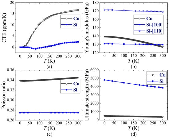 Temperature-dependent material properties of Si and Cu: (a) CTE, (b) Young’s modulus, (c) Poisson’s ratio, and (d) ultimate strength.