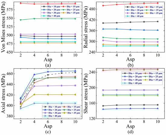 (a) Von Mises, (b) radial, (c) axial, and (d) shear stress for various Dias and Asps.