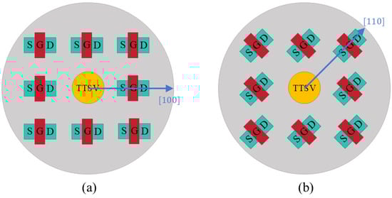 Schematic diagram of MOSFET distribution in the [100] (a) and [110] (b) channel directions around TTSV.