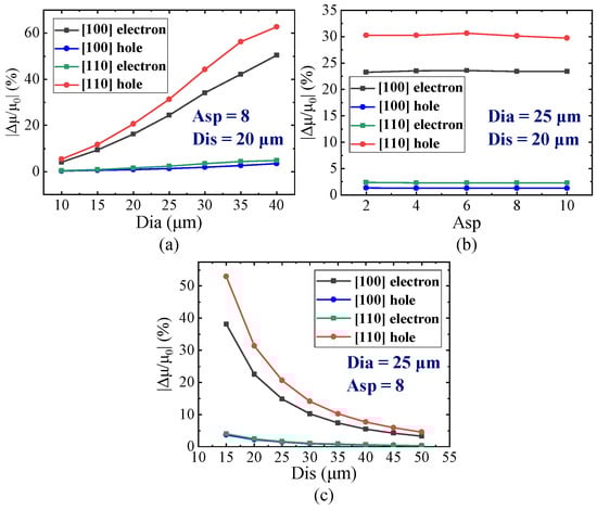Influence of (a) Dia, (b) Asp, and (c) Dis on variation rate of carrier mobility.