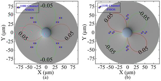 Due to the near-surface positioning of MOSFET, it is imperative to analyze the impact of Dia and Asp, as well as the distance between the TTSV and MOSFET (Dis) (Figure 9a) on carrier mobility. As depicted in Figure 10a, while the Dis is 20 μm and the Asp is 8, the carrier mobility variations are positively correlated with the Dia, especially the electron mobility in the [100] crystal orientation and the hole mobility in the [110] crystal orientation, surging with the increase in Dia. There is no correlation between carrier mobility variation and Asp (Figure 10b). With a Dia of 25 μm and an Asp of 8, as illustrated in Figure 10c, the variation rate of carrier mobility changes inversely with Dis. Specifically, the electron mobility variation in the [100] crystal orientation and the hole mobility in the [110] crystal orientation experience significant reduction with an increase in Dis. The hole mobility in the [100] crystal orientation and the electron mobility in the [110] crystal orientation change little with Dia and Dis, and there are no corresponding KOZ around the TTSV. The P-Metal-Oxide-Semiconductor (PMOS) with a [100] channel direction and the N-Metal-Oxide-Semiconductor (NMOS) with a [110] channel direction can be arranged anywhere around the TTSV. The KOZs with the electron in the [100] crystal orientation and the hole in the [110] crystal orientation are larger in the X/Y and XY directions, respectively, and the mobility of the electron in the [100] crystal orientation and the hole in the [110] crystal orientation shifts greatly with Dia and Dis. For the optimal device arrangement, as shown in Figure 11, the NMOS with a [100] channel direction and the PMOS with a [110] channel direction near TTSV should be placed in XY and X/Y directions, respectively. For a small Dia or when the remote arrangement is allowed, it is advisable to orient NMOS and PMOS in a [110] and a [100] channel direction, respectively.