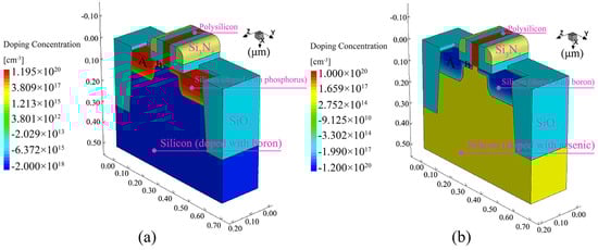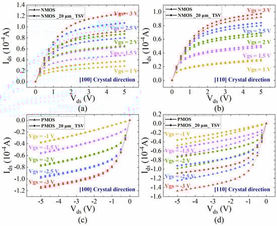 The nanoscale MOSFET models are established by device simulation tool Sentaurus to analyze the effect of carrier mobility variations provoked by TTSV thermal stress on the saturation current of MOSFET. The structural profiles of NMOS and PMOS are illustrated in Figure 12, and the characteristic parameters are presented in Table 1. For the 25 μm of Dia, Figure 13 plots the characteristic curves of the carrier mobility of NMOS and PMOS located 20 μm away from the TTSV at different gate voltages, where the deviation in drain current (Ids) depends on gate voltage (Vgs), drain voltage (Vds), device type, and channel direction. For the NMOS with a [100] channel direction (Figure 13a) and the PMOS with a [110] channel direction (Figure 13d), the larger absolute values of Vgs or Vds result in more pronounced curve deviations and greater changes in saturation current, reaching the maximum deviation of 34.3% at 3 V and 37.7% at −3 V for Vgs. However, the saturation current remains relatively stable for the NMOS with a [110] channel direction (Figure 13b) and the PMOS with a [100] channel direction (Figure 13c). The deviation in saturation current resulting from TTSV thermal stress is directly linked to gate-level delay, and the cumulative effect of cell delays can significantly impact circuit-level delay []. Due to the serious drift of saturation current under the thermal stress of TTSV, further research is conducted on the effects of Dia, Asp, and Dis on the saturation current. As depicted in Figure 14a, the variation rate of the saturation current for the NMOS and PMOS with a Dis of 20 μm and Asp of 8 increases with an increase in the Dia, and the increase is more significant for the NMOS with the [100] channel direction and the PMOS with the [110] channel direction. The Asp demonstrates a minimal impact on the variation rate of the saturation current (Figure 14b). The rate decreases with an increase in Dis (Figure 14c), where the NMOS with the [100] channel direction and the PMOS with the [110] channel direction exhibit significant variations.