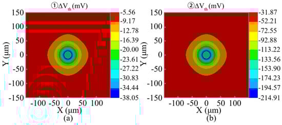For the NMOS and PMOS devices affected by thermal stress from TTSV with a Dia of 25 μm, Figure 16 shows that the threshold voltage variation exhibits approximately double symmetry around the TTSV and the absolute values decrease as the Dis increases. At a Dis of 20 μm, the variation values of the threshold voltage for standard cases ① and ② are −9.96 and −56.65 mV, respectively. Due to the extensive coverage of TTSV stress compared to the single logic gate layout, the threshold voltage shifts in all transistors of the same type are uniform in magnitude [,]. Based on the superposition effect, even the minor change in threshold voltage induced by TTSV thermal stress can result in an exponential increase in gate leakage power and a wide range of circuit timing. Since this study focuses on a 2D analysis of the threshold voltage, the correlation with Asp is not investigated. The absolute value of threshold voltage variation in MOSFET is positively correlated with Dia for the Dis of 20 μm (Figure 17a) and negatively correlated with Dis for the Dia of 25 μm [see Figure 17b]. The effect trends of the Dia and Dis on carrier mobility, saturation current, and threshold voltage are the same.