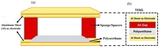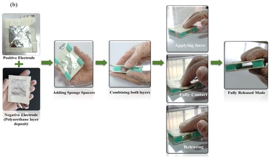 The planned triboelectric NG device undergoes fabrication. TENG gadgets only employ polyurethane. A sponge separates the TENG, ensuring triboelectric phenomena between the Al electrode and the PU layer. The suggested TENG combines two Al electrodes—one on top and one on the bottom—with PU on that layer. Cost-effective, flexible, and high-performance TENGs are developed for harvesting ambient mechanical energy, such as human motion. In the developed TENG device, landfill and recyclable materials are repurposed, with ultraviolet (UV) light-curable polyurethane (PU) and Kapton tape as a tribo-layer. A sponge, repurposed from landfill waste, acts as a spacer to maintain a consistent air gap between the tribo-layers for enhanced triboelectrification, while recycled aluminum kitchen foil is utilized as electrodes. The developed TENG not only opens ways to repurpose these aluminum foil and landfill sponge materials but also shows strong performance, with a power density of 8.53 W/m2. The coated layer was cured under UV light for 30 min to ensure complete drying. Two electrodes are layered and separated by sponge spacers to create a homogeneous air gap for the triboelectric effect. The proposed design also uses sponge spacers for TENG contact separation, improving TENG performance. This arrangement harvests the generator’s vertical tension throughout the pushup/pressure cycle, as shown in Figure 4b.