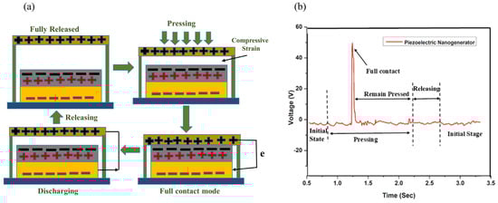 (a) Complete mechanism process of the proposed TENG. (b) Generated Output voltage.