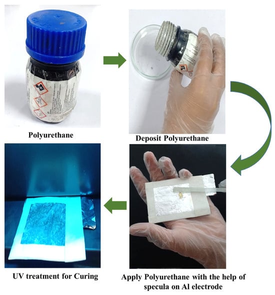 In the design principle of the triboelectric nanogenerator, first, a PET sheet is taken and covered with aluminum foil, which acts as an electrode. Then, polyurethane (PU) is taken into the darkroom to melt as a thin solution because polyurethane (PU) is a versatile synthetic polymer used to make triboelectric nanogenerators (TENGs) to generate electricity. Polyurethane is applied in the middle of the bottom electrode layer-by-layer with the help of a spatula to create a very thin smooth layer and act as a UV treatment for curing the PU layers smoothly. The UV treatment is provided to cure the surface and make it smooth, as shown in Figure 3. Once it is completely dry, another top electrode is made with a PET sheet covered with aluminum foil.