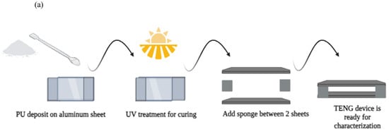 Figure 4a presents an overview of the manufacturing process of the TENG device. UV-curable polyurethane (PU) polymer was acquired from Photopolymer Pts Ltd. (Singapore) and utilized in the device’s fabrication. Ultraviolet wavelengths are considered very effective electromagnetic wavelengths due to their ability to rapidly cure, dry, and solidify many materials, including polymer resins, adhesive films, dyes, and paints. We used a UV nail lamp (Model LN-818P, Ningbo Joystar tools Co., Ltd., Ningbo, China) for UV curing, which reduces adhesion and hardens and dries the applied layer. We subjected the fabricated devices to the UV ozone for ten minutes within a sealed, transparent glass cylindrical container. Figure 4a also displays an image of the synthesized TENG layer on aluminum foil.