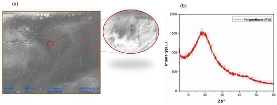 (a) SEM image of PU. (b) X-ray Diffraction (XRD) Results.