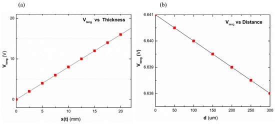 Figure 6 illustrates how a few important geometric characteristics affect the device’s performance. Figure 6a shows the Vteng fluctuation with d and x(t). This figure provides potential TENG geometry synthesis settings, which are important to device performance. Theoretical analysis of contact mode TENG performance indicates that varying the triboelectric surface thickness, air gap, and surface choppiness can maximize the output voltage Vteng.