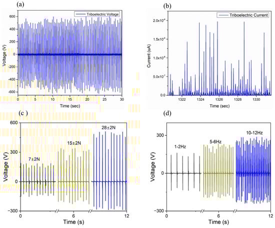 (a,b) TENG Voltage (V) and Current (µA) graphs with respect to time (s). (c) Voltage output response with varying applied forces. (d) Frequency-dependent output response of the TENG device.