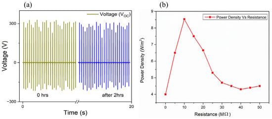 As the load resistance increased, the voltage across the load also increased, demonstrating the device’s ability to handle high-resistance loads effectively. The maximum power density was observed at a load resistance of 10 MΩ, likely due to impedance matching with the oscilloscope. TENGs’ high voltage and low current characteristics result in mega-ohm internal impedance. Maximum power transfer happens when external load resistance meets the device’s internal impedance. Many studies on polyurethane-based TENGs show that they produce large amounts of power when connected to load resistances between 1 MΩ and 100 MΩ, with 10 MΩ being the best choice. The highest power density at 10 MΩ is obtained by ensuring that the external load matches the internal impedance of the polyurethane-based TENG. Experimental data, usually power–resistance charts, show this in Figure 8b. These results highlight the importance of load impedance optimization for achieving peak power output. To evaluate the stability and durability of the TENG device, continuous force was applied using a force applicator set to approximately 15 N with a frequency of 3–5 Hz. The output voltage was recorded initially and then again after two hours of operation, as shown in Figure 8a.