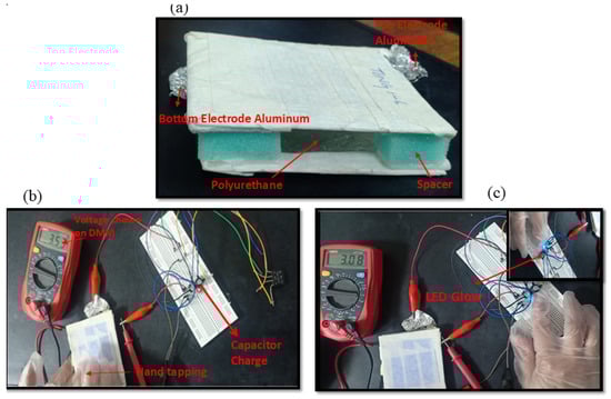 The designed TENG is shown in Figure 9 (full image), with the arrowhead indicating the top and bottom electrodes made of aluminum, the polyurethane, and the sponge spacers. In Figure 9b, the circuit shows the charging of the capacitor with the help of continuous hand tapping on the TENG. DMM shows the voltage that charges the capacitor at 3.53 V to illuminate the LED. In Figure 9c, when the capacitor stores the charges at 3.53 V, the button is used to toggle an LED. When the button is pushed, the LED will glow, as shown in Figure 9c.