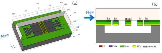 Based on the considerations mentioned above, the structural diagram and cross-sectional diagram of the thermal microflow sensor in this paper were determined as depicted in Figure 1a,b. The sensor comprised five main components: a porous silicon substrate, a heat-insulating cavity, a microflow channel, thermistors, and a heater. The fabrication of the sensor involved its construction on a porous silicon substrate. Etching was performed on the substrate to create a heat-insulating cavity. A micro-bridge and four micro-beams made of silicon nitride were positioned above the cavity, providing support for the heater located at the center and the four thermistors. The structure of the sensor as illustrated in the diagrams enabled the reduction of lateral heat conduction, thereby enhancing its sensitivity and minimizing power consumption. The dimensions of the porous silicon substrate were 0.8 mm × 0.4 mm × 0.1 mm, while the cavity measured 0.6 mm × 0.2 mm × 0.05 mm. The dimensions of the microchannel were 0.8 mm × 0.2 mm × 0.1 mm, and the microbridge and microbeams both had a thickness of 2 µm.