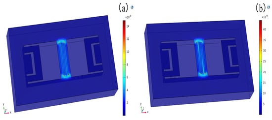 In this thermal microflow sensor, the Si3N4 micro-bridge and micro-beams primarily serve as supports and provide heat insulation. Given the miniaturization of the device, the mechanical support capability of these components is of utmost importance in the design. Neglecting this aspect could lead to warping, deformation, and potentially cause structural damage or collapse, resulting in the device’s failure to function properly. Therefore, a comprehensive set of multi-physics simulations encompassing thermal expansion, electromagnetic heating, solid mechanics, and membrane behavior were conducted to guide the design of the microstructure. Figure 3 illustrates the distribution of equivalent stress in the micro-bridge and micro-beams of the sensor. This analysis provides insights into the stress levels and potential areas of concern within these components. By examining the stress distribution, designers can identify regions that may be prone to failure or excessive deformation. This information is crucial for optimizing the microstructure’s design to ensure its mechanical integrity and durability under operating conditions.