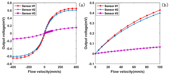 The output voltage of the three sensors increased with the flow rate in the range of 0–400 mm/s, as depicted in Figure 5. With a low rate of flow (<100 mm/s), the voltage exhibited a linear relationship with the flow rate. However, as the flow rate continued to rise, the voltage increase gradually diminished and approached saturation. Consequently, the linear output range of the sensors was 0–100 mm/s.