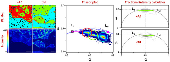 In this work, the fluorescent probe Ge1L, which owns a chemical structure inspired by the GFP chromophore, a membrane-targeting lipid moiety and distinct fluorescence lifetimes when distributed within lipid ordered (Lo) or disordered (Ld) phases [49,50,51], has been tested under FLIM-ϕ to quantify alterations in cell membrane order upon exposure to moderate concentrations of Aβ.