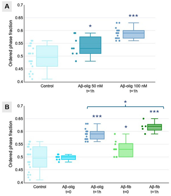 The calculated fractional intensities are reported in Figure 2 as box plots for easy comparison. Figure 2A shows that after one hour of incubation with Aβ-olig 50 nM, a perceptible increase in the degree of membrane order can be observed (*, p ≤ 0.05, Student’s t-test), and that this degree further increases if incubation is performed with a 100 nM concentration of peptide (***, p ≤ 0.001, Student’s t-test), reaching an average Lo fraction of 0.59.