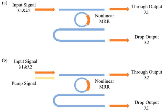 Specific to this work, as shown in Figure 1, the input optical signal with a wavelength and , stands for the 0 and 1 states of the digital signal, corresponding to a low level and high level, respectively. When there is no pump light, the nonlinear MRR remains in its initial state, the THROUGH port outputs the light with the wavelength , and the DROP port outputs the light with the wavelength , as shown in Figure 1a. On the contrary, when the pump light enters into the micro-ring, it produces a modulation of the MRR, changing the resonance state. Under the appropriately designed parameters, the resonance state shifts to . Note that, as shown in Figure 1b, the THROUGH port outputs light with a wavelength , and the DROP port outputs light with a wavelength . Therefore, by utilizing the modulation effect of nonlinear MRR and optical pumping, it is possible to establish a conversion relationship between the input and output signal wavelengths, thereby representing the logical transformation between digital 0 and 1.