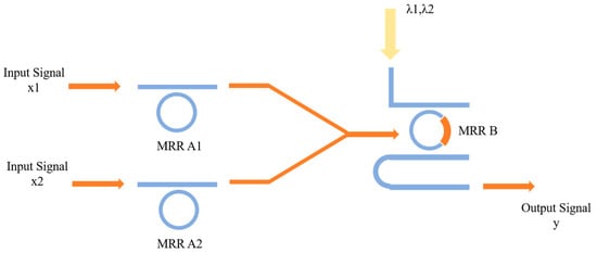 where and are the input signals, and denote the OR operation and NOT operation, respectively, and is the output signal representing the result of the operation. The operation of the optical structure is depicted (illustrated) in Figure 4.