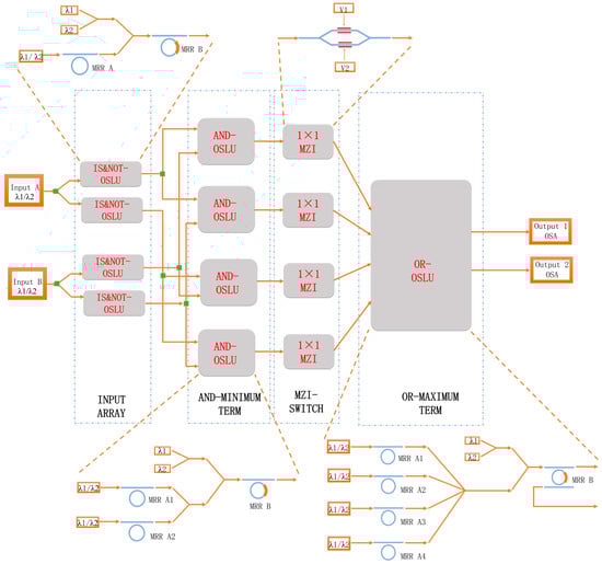 The proposed PPLA is organized based on the sum-of-products type, utilizing minimum term units. Building on the three optical standard logic units designed in Section 2.2, IS&NOT, AND, and OR, the photonic logic array structure is constructed through multilevel linkage to realize arbitrary combinations of logic functions. The design structure is illustrated in Figure 5.