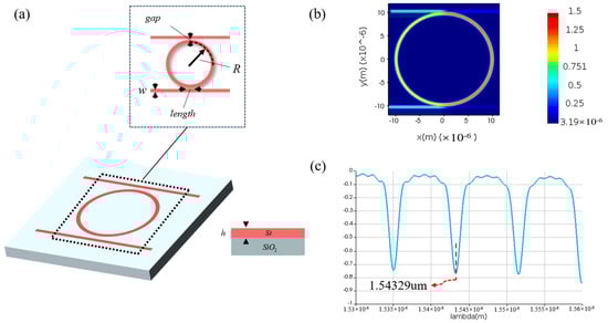 The bending radius, coupling spacing, and coupling length of MRR seriously affect its key characteristics such as resonant wavelength, free spectral range, and Q value. In order to achieve resonance at specific wavelengths, we performed optical simulations of MRR based on the finite-difference time-domain method. Through parameter sweeping, we optimized the MRR design with a bending radius of 9.775 µm, a coupling length of 0.3 nm, and a coupling spacing of 0.1 nm. The resulting resonant wavelength is 1543.29 nm. The structure and optical field transmission of the MRR are illustrated in Figure 6.