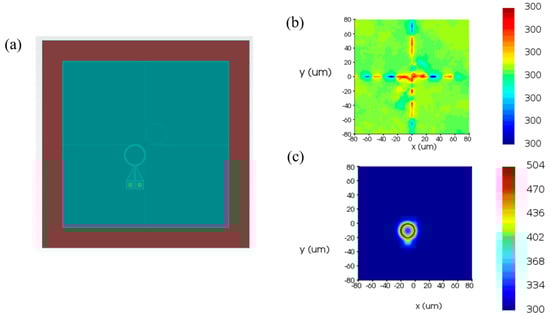 Temperature distribution of MRR. (a) Model for thermal simulation. (b) Voltage is 0 V. (c) Voltage is 2.667 V.