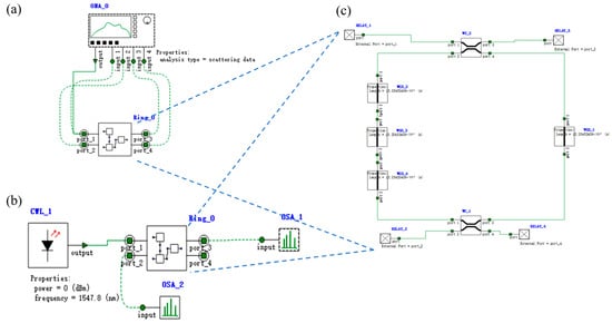 The model for linear MRR. (a) Frequency-domain simulation. (b) Time-domain simulation. (c) Structure of linear MRR. OSA: Optical spectral analyzer. CWL: Continuous wave laser. Ring: Micro-ring resonator. WGD: Straight waveguide. WC: Waveguide directional coupler.
