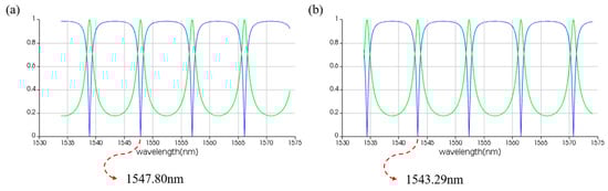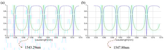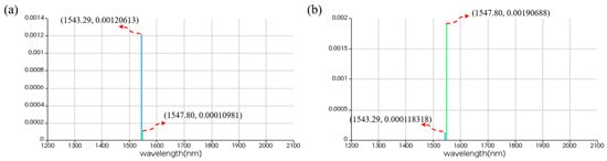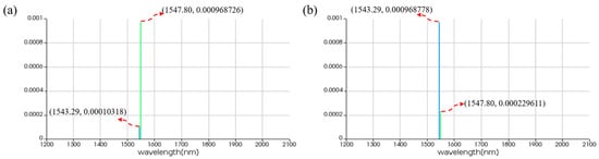 Simulation results of IS-OSLU at Through port. (a) When input wavelengths are 1543.29 nm. (b) When input wavelengths are 1547.80 nm. The horizontal axis represents the wavelength unit in nm, and the vertical axis represents the output power unit in W.