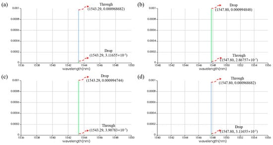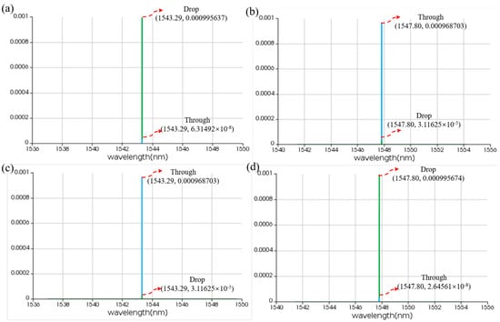 For the OR logic function, MRR A1 and MRR A2 are linear micro-ring resonators with resonance wavelengths of 1543.29 nm. MRR B is a nonlinear MRR with a resonance wavelength of 1547.80 nm in the absence of thermal tuning when light is acting upon it; otherwise, it shifts to 1543.29 nm. Simulation results are shown in Figure 20. When the logic signal is 00, i.e., both input light wavelengths are 1543.29 nm, the Drop port outputs light with a wavelength of 1543.29 nm, represented as logic signal 0. When the logic signal is 10 or 01, i.e., the input light wavelengths are 1543.29 nm and 1547.80 nm, the Drop port outputs light with a wavelength of 1547.80 nm, represented as logic signal 1. When the logic signal is 11, i.e., both input light wavelengths are 1547.80 nm, the Drop port outputs light with a wavelength of 1547.80 nm, represented as logic signal 1. The simulation results indicate that the Through output port of OSLU under this kind of configuration successfully realizes the OR logic function.