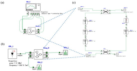 Note that the utilization of optical attenuators (OAs) and Mach–Zehnder Interferometers (MZIs) is also required in our design, which plays a critical role in the system link simulation. The optical attenuator primarily coordinates the input/output energy balance between circuits, while the MZI implements the programmable function, serving as an optical switch. In order to make the logic array function programmable, a scripting language approach is employed. This involved setting the power threshold and attenuation parameters of the attenuator based on the results obtained from the spectrum analyzer OSA, as well as setting the bias voltage of the MZI according to the required selection and combination.