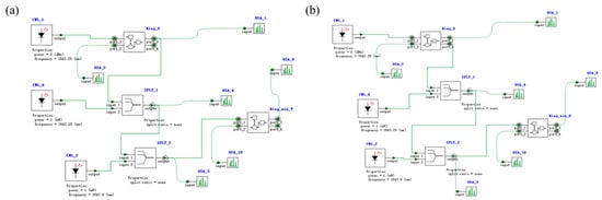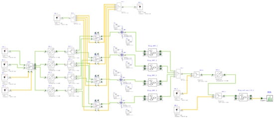 According to the PPLA schematic diagram shown in Figure 5, the corresponding optical simulation structures are set up as illustrated in Figure 21. Continuous wave light sources CWL_1 and CWL_2 firstly generate logical complementary input signals through IS&NOT-OSLU (INPUT unit, as depicted in the figure). Then, these input signals are fed into AND-OSLU (AND unit, also shown in the figure) to perform the AND logic computing, resulting in four minimum terms. Subsequently, the MZI-ARRAY (MZM units, illustrated in the figure) is driven by DC source. By leveraging its distinct switching states, the MZI-ARRAY provides varied inputs to the OR-OSLU. Ultimately, the OR-OSLU completes the OR operation among any minimal terms, thereby realizing the desired logical functions. The OR-OSLU is a four-input unit, which consists of four Ring_OFF elements corresponding to MRR A, as well as one Ring_noT_non_1/4_1 element corresponding to MRR B (as depicted in the figure). The drop port of the final MRR serves as the output for the entire optical logic structure, allowing for the observation of the optical power outputs at both wavelengths. In addition, an optical attenuator is also used to adjust the light intensity between each stage of the MRR, effectively balancing the input and output power at each stage. Similarly, the logic signal 0 is defined as light with a wavelength of 1543.29 nm and the logic signal 1 is defined as light with a wavelength of 1547.80 nm.