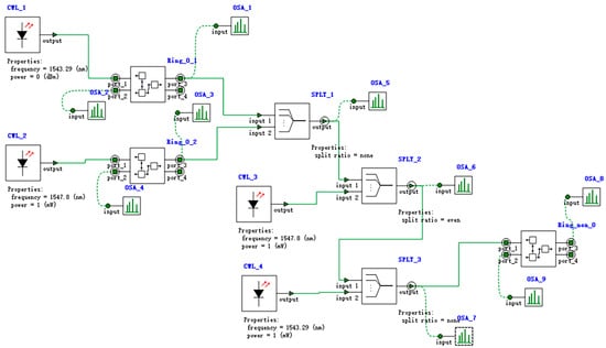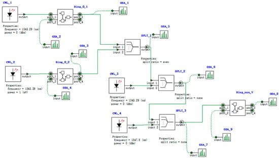 Based on the OR-OSLU schematic diagram shown in Figure 4, the optical simulation structures are set up as illustrated in Figure 19. There are two continuous wave light sources CWL_1 and CWL_2 operating at wavelengths of 1543.29 nm or 1547.80 nm. As the input optical logic signals, they are simultaneously input to Ring_0_1 and Ring_0_2, corresponding to the MRR A1 and MRR A2. Their output acts on Ring_non_V, corresponding to the MRR B, while the input is provided by two other continuous wave optical sources CWL_3 and CWL_4, whose operating wavelengths are 1543.29 nm and 1547.80 nm, respectively. The output signal is detected by optical spectrum analyzers OSA at the DROP port of Ring_non_V, used to characterize the logic function. The logic signal 0 is defined as light with a wavelength of 1543.29 nm, and the logic signal 1 is defined as light with a wavelength of 1547.80 nm.