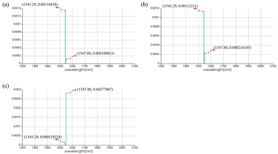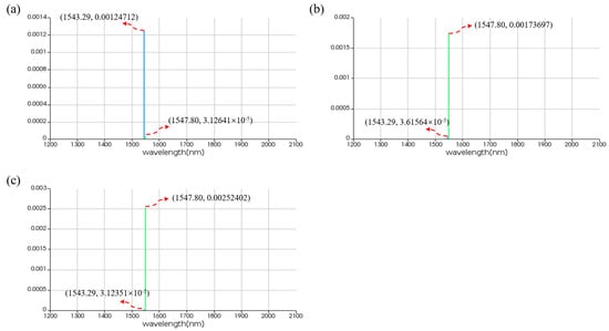 Simulation results of AND-OSLU at Through port. (a) Input wavelengths are 1543.29 nm and 1543.29 nm. (b) Input wavelengths are 1543.29 nm and 1547.80 nm. (c) Input wavelengths are 1547.80 nm and 1547.80 nm. The horizontal axis represents the wavelength unit in nm, and the vertical axis represents the output power unit in W.