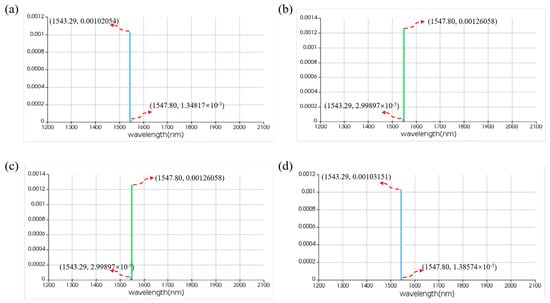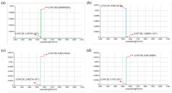 Simulation results of two-input PPLA for logical function of . (a) Input wavelengths are 1543.29 nm and 1543.29 nm. (b) Input wavelengths are 1543.29 nm and 1547.80 nm. (c) Input wavelengths are 1547.80 nm and 1543.29 nm. (d) Input wavelengths are 1547.80 nm and 1547.80 nm. The horizontal axis represents the wavelength unit in nm, and the vertical axis represents the output power unit in W.