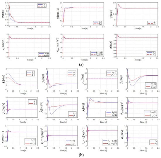 The controlled state variables related to the AMB rotor (components of the vector) are calculated with Formula (6) using the components of the vector (measured by the total linear displacement sensors, arranged on the rotor axes). The rotation angles and of the gimbals are measured by the angular transducers arranged along the DGMSGG gimbals’ axes (both inner and outer gimbal), as shown in Figure 1a. To determine the state variables , , , , , and , the three linear state observers (44), (55), and (54) are used, as well as the state variable vectors and of the reference models.