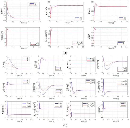 The next 12 groups of graphs in Figure 4b and in Figure 5b express the dynamics of the variables of the subsystem in Figure 2b for the stabilization mode and the orientation mode, respectively. The graphs for , , and are effectively identical for the two operating modes, as they are state variables related to the reference model (30), which is not influenced by the subsystem in Figure 3a.