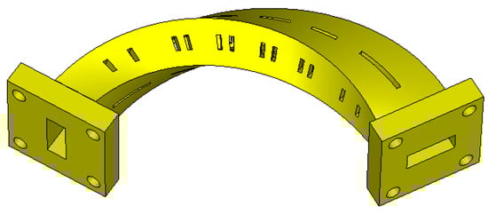 Waveguide BPFs that integrate bending and twisting functions have also been extensively researched and tested by 3D printing. They have compact configurations and high flexibility in communication systems. Traditionally, the design methods aim to cascade waveguide bends or twists with BPFs, resulting in a large volume and an inevitable deterioration in insertion loss. An advanced solution provides a higher integration and better RF performance, which directly applies rotation to the structures of BPFs, to achieve filtering and bending or twisting simultaneously. Notable studies include a lowpass filter with a 90° bend and a 90° twist [15], two 90°-twisted waveguide BPFs utilizing step-twisted rectangular waveguide resonators [16] and gradually twisted ones [17], and a 90° bent–twisted BPF using gradually distorted rectangular waveguide resonators [18]. And, in [14], BPFs based on elliptical or ellipsoidal resonators are proposed to achieve more flexible waveguide routines.