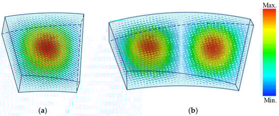 Electric fields of distorted waveguide cavities: (a) TE101 mode cavity; (b) TE102 mode cavity.