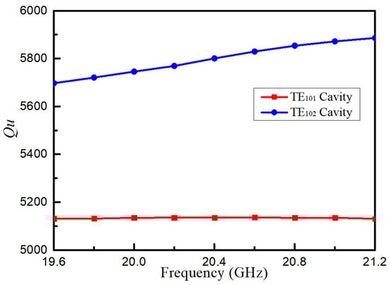 where c = 3 × 108 m/s is the speed of light in a vacuum, a is the width of the waveguide, θ is the bending angle, and r is the bending radius. The unloaded quality factors Qu of the two types of cavities are pictured in Figure 3. The cavity walls are assumed to be made of copper, with electrical conductivity at 5.96 × 107 S/m. A higher Qu of the TE102 cavity can be observed, which resulted from a larger volume, and consequently contributes to a lower insertion loss.
