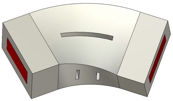 where Δf3dB is the 3 dB bandwidth of |S21| in the simulation of the doubly loaded resonators and f0 is its center frequency [27]. The doubly loaded resonator is composed of a resonator, two irises, and two waveguide ports. Inductive irises with a width of 2.5 mm are employed to achieve weak coupling. Consider a doubly loaded TE102 mode resonator as an example, where all of the slots have a width of 1 mm and the equivalent length of the vertical slots on the side walls is 3 mm, as shown in Figure 4. Firstly, the metal model with no slots is simulated as a perfect electrical conductor (PEC), yielding Qe = QL = 2.2531 × 104, since there is no radiation or conductor loss and Qc−1 = Qr−1 = 0 in this case. Next, a PEC slotted model is simulated to obtain a QL= 1.9159 × 104 and Qr = (QL−1 − Qe−1)−1 = 1.2800 × 105, because Qc−1 = 0 for the same reason mentioned above. Finally, a slotted model with a copper boundary is simulated, yielding QL = 4.2463 × 103 and Qc = (QL−1 − Qe−1 − Qr−1)−1 = 5.4555 × 103. We can conclude that Qr is much higher than Qe and Qc, resulting in a much lower influence on QL. Qu is calculated as 5.2325 × 103 from Equation (4), which is close to the Qu (5.8721 × 103) of the unslotted TE102 resonator. The above calculations demonstrate that the slots opened along the direction of the current have a negligible impact on the increase in insertion loss.