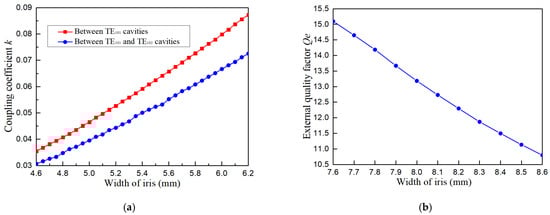 Extraction of the width of an iris: (a) coupling coefficient k against the width of the iris; (b) external quality factor Qe against the width of the iris.