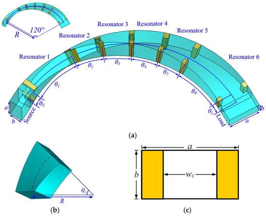 Waveguide bandpass filters (BPFs) are essential components in communication systems, offering low insertion loss, high power handling capacity, and great frequency selectivity. However, with the rapid advancement of wireless communication technology, traditional waveguide filters face significant challenges, particularly in terms of size and weight. To address these challenges, key trends in filter design have shifted towards miniaturization, integration, lightweight structures, and multifunctionality [1,2,3,4,5]. In response to these evolving demands, researchers have proposed more complex filter structures, such as irregular resonators, novel coupling schemes, and flexible waveguide designs. Despite their potential, these designs often present fabrication challenges, especially when using traditional Computer Numerical Control (CNC) techniques. In this context, 3D printing has emerged as a promising fabrication solution. By enabling the creation of monolithic structures, 3D printing eliminates the need for complex cutting and milling processes, offering a more streamlined approach to manufacturing. A variety of 3D-printed waveguide BPFs have been proposed in recent years, and filters based on spherical resonators are one of the most widely researched fields [6,7,8,9,10,11]. Spherical resonators have higher unloaded quality factors than rectangular cavities, contributing to a lower insertion loss. However, the high symmetry of the spherical structure leads to resonant frequencies of higher-order modes becoming more closely spaced, thereby reducing stopband rejection. On some occasions, short slots are added to the cavity walls to suppress the harmonic response of undesired modes [12]. Further, hemisphere and elliptical resonators have also been proposed [12,13,14].